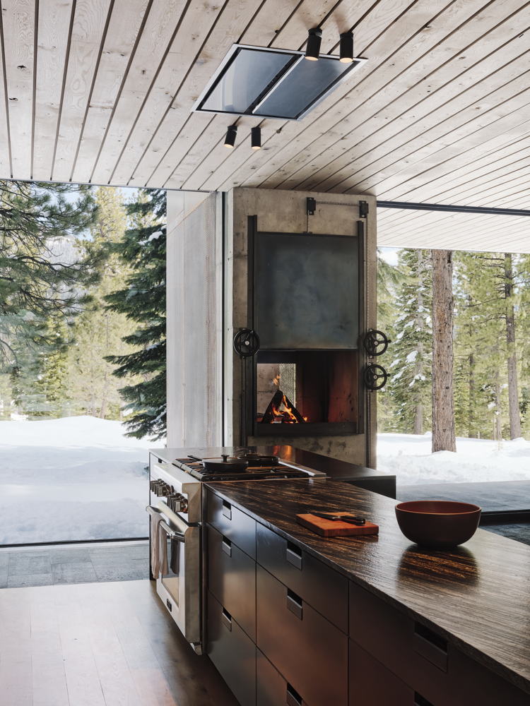 The “treehouse,” a three-story tower, rises above the main volume of the home. Solid steel cladding grants privacy to the tower’s street-facing north side, transitioning to large areas of transparency on the other sides of the tower, which are protected by year-round tree cover. The treehouse provides bedrooms and attached baths for guests as well as a roof-top deck with views to Northstar Ski Resort.